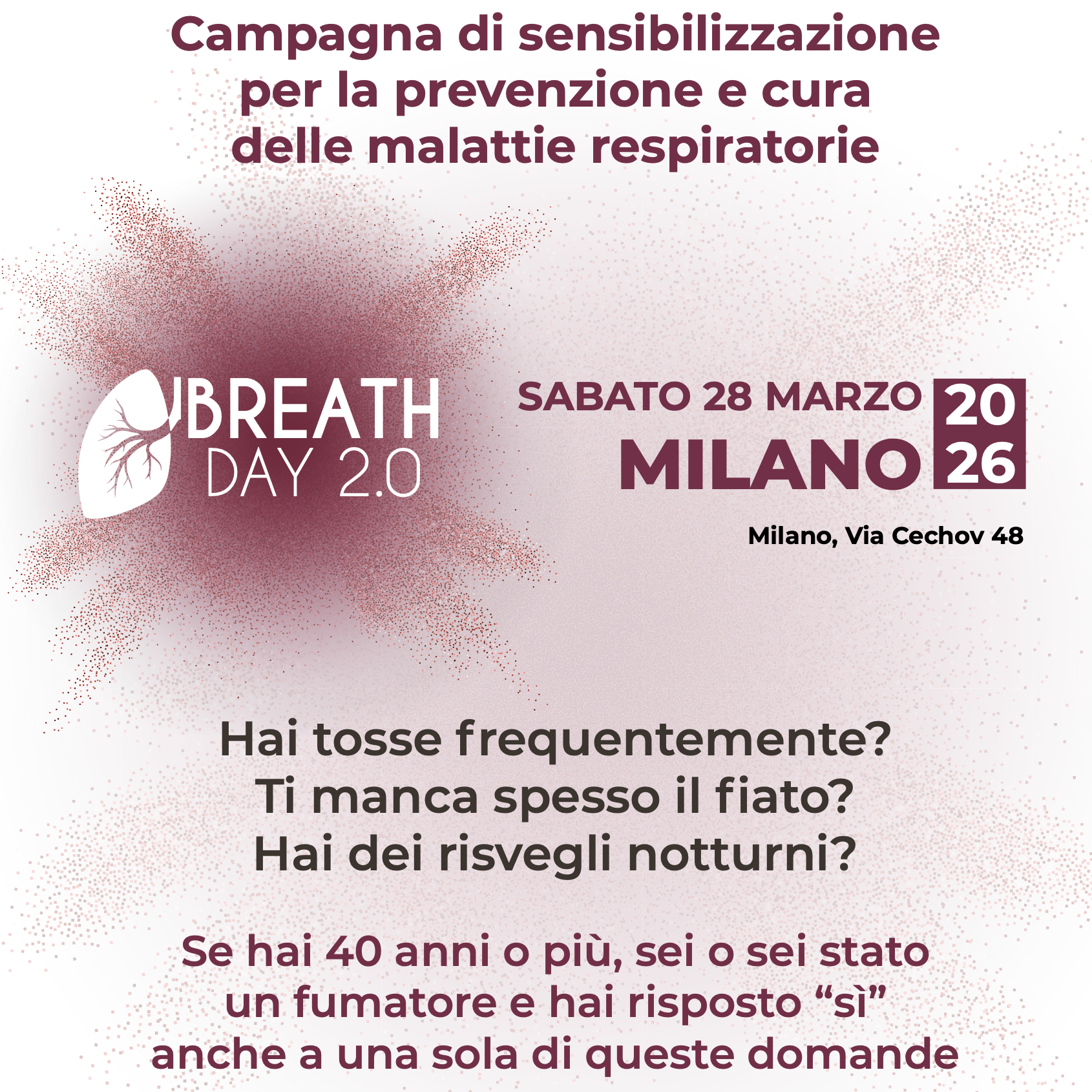Campagna di awareness BREATHday 18/04/26ambulatori medici e piazze di 12 città italiane (Ercolano (NA), Napoli, Bologna, Pontinia (LT), Roma, Ostia, Nettuno (RM), Seriate (BG), Milano, Torino, Siena e Mira (VE).) SCARICA IL PROGRAMMA